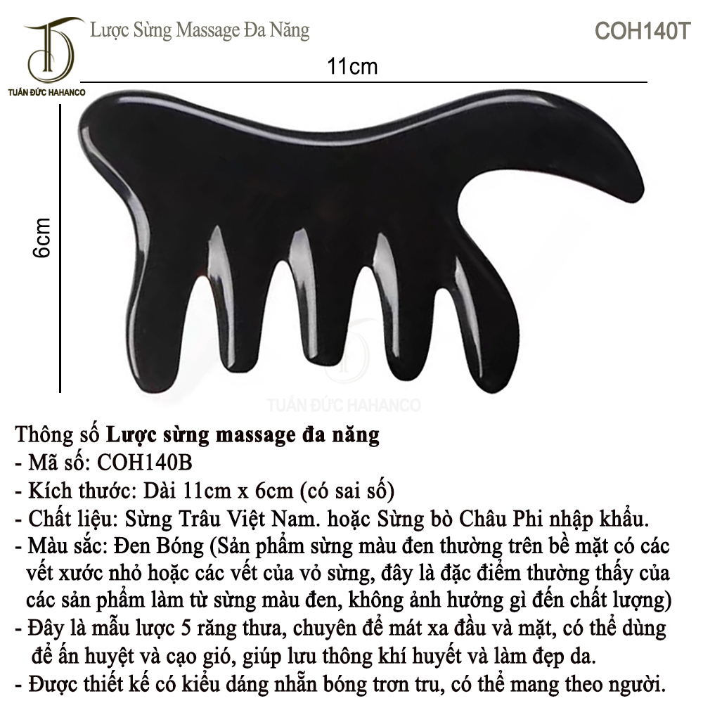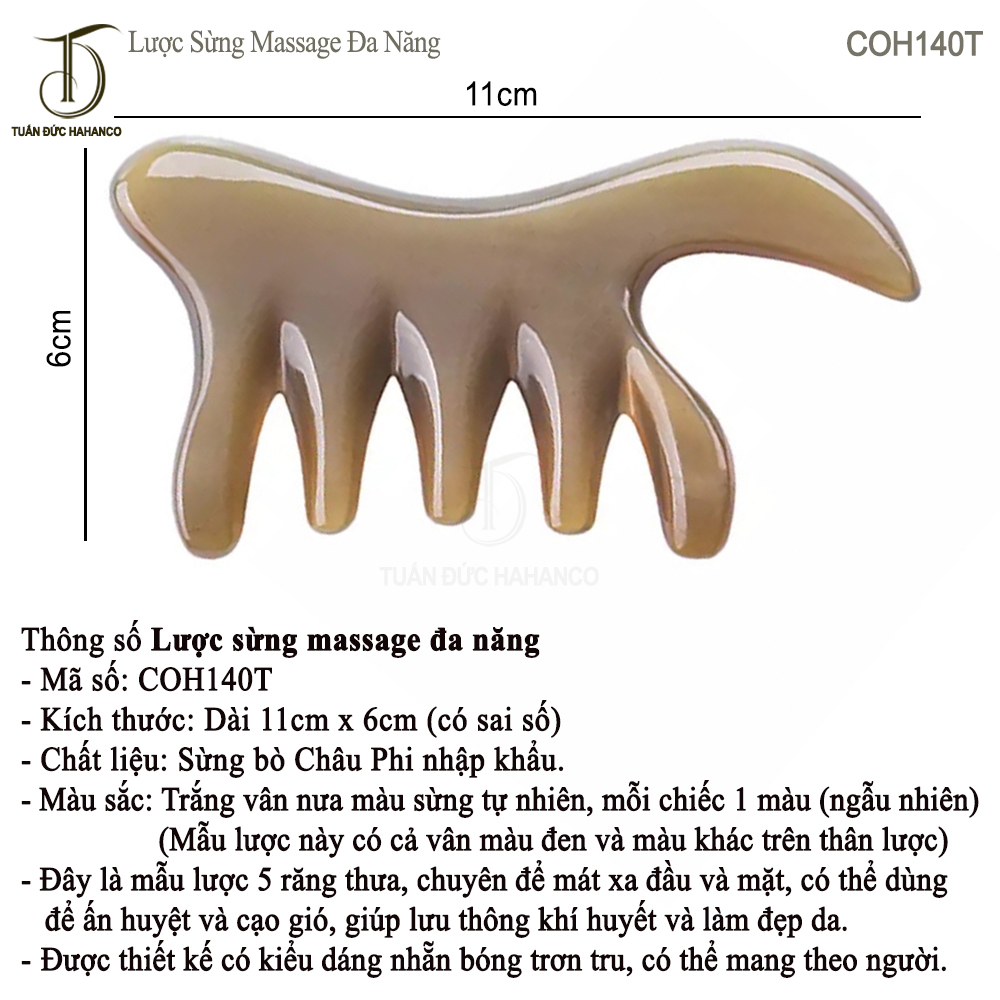 – Đây là chiếc lược sừng mát xa đa năng cao cấp và đặc biệt, dày và rất đẹp, răng thưa, đầu răng tròn, vừa để chải các loại tóc xoăn, xù, rối. massage đầu và các bộ phận khác giúp tuần hoàn và lưu thông máu cực tốt, thư giãn sảng khoái, răng lược còn có tác dụng điểm huyệt, sống lược dùng để cạo gió. nhỏ gọn có thể bỏ túi.
