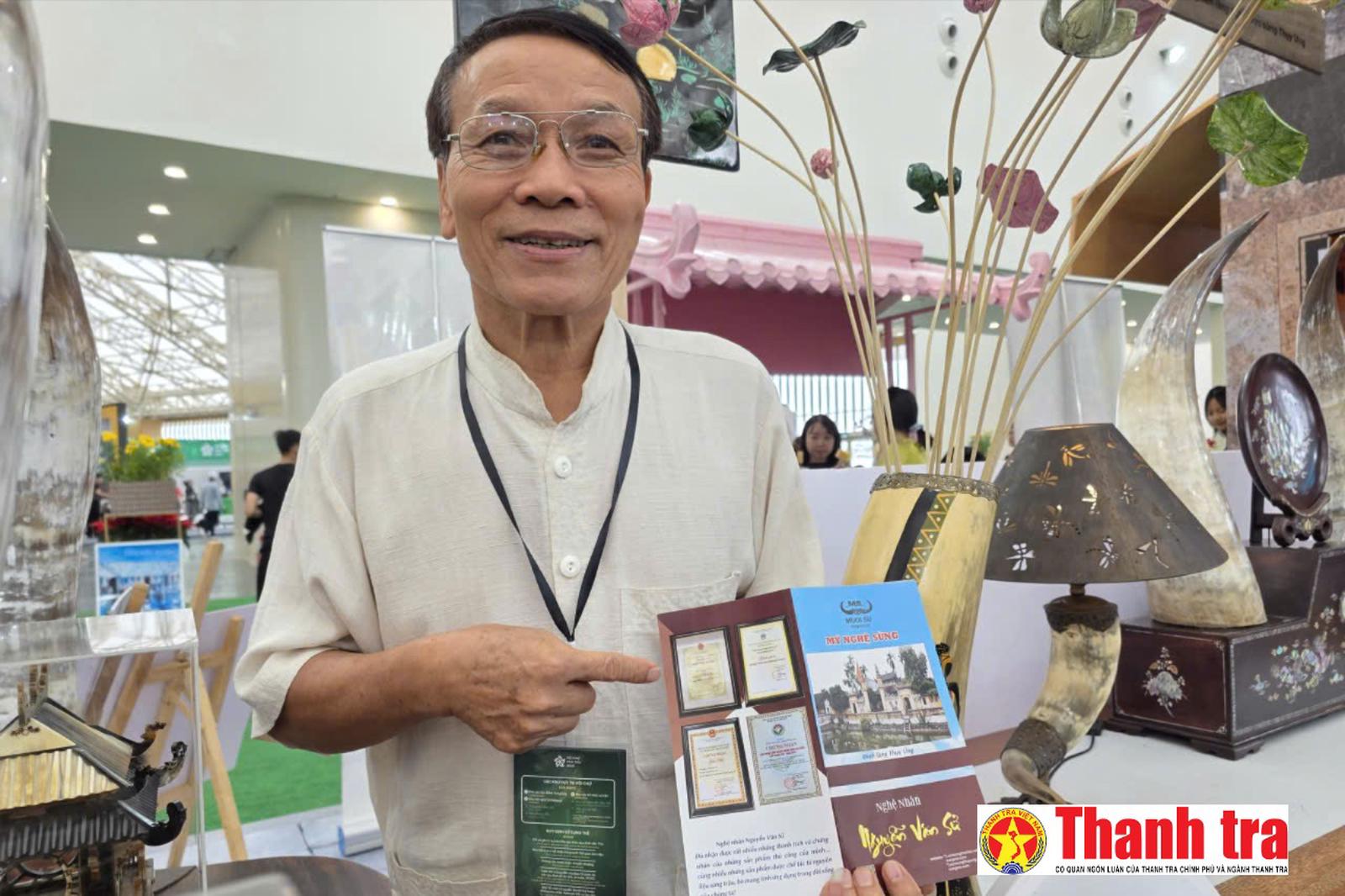 Nghệ nhân Nguyễn Văn Sử giới thiệu những chứng nhận về tay nghề và sản phẩm mỹ nghệ sừng tinh xảo của mình. Từ sừng trâu, sừng bò, ông đã thổi hồn để tạo nên những tác phẩm nghệ thuật có giá trị văn hóa và kinh tế. Thông qua đôi bàn tay tài hoa, ông không chỉ gìn giữ nghề truyền thống mà còn làm giàu chính đáng trên quê hương mình. Ảnh: Đông Hà