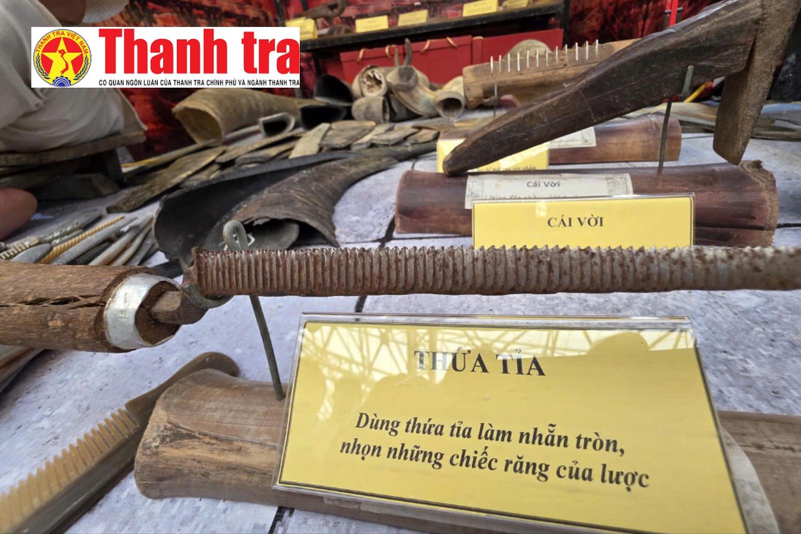 Những công cụ nghề cũ kỹ vẫn được ông giữ nguyên. “Thứ tỉa, cái vời, cái dũa, cái cưa này theo tôi hơn 40 năm, không chỉ là dụng cụ mà là kỷ vật của làng nghề”, ông Sử kể, ánh mắt đầy trân trọng. Ảnh: Đông Hà